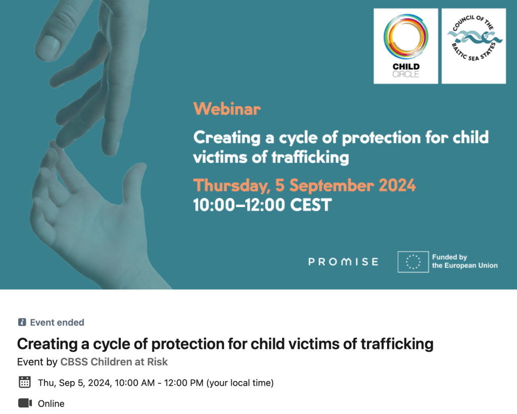 Webinar: Creating a circle of protection for child victims of traffickingTogether with Rebecca O Donnell – CHILD CIRCLE Director – I joined and contributed to a discussion, moderated by Veikko Mäkelä from Council of the Baltic Sea States (CBSS) – on child trafficking and the Guidance we developed to help States ensuring that the children’s needs and rights are met through early identification, support and assistance in criminal justice and child protection procedures: eventually creating a cycle of protection for trafficked children.
